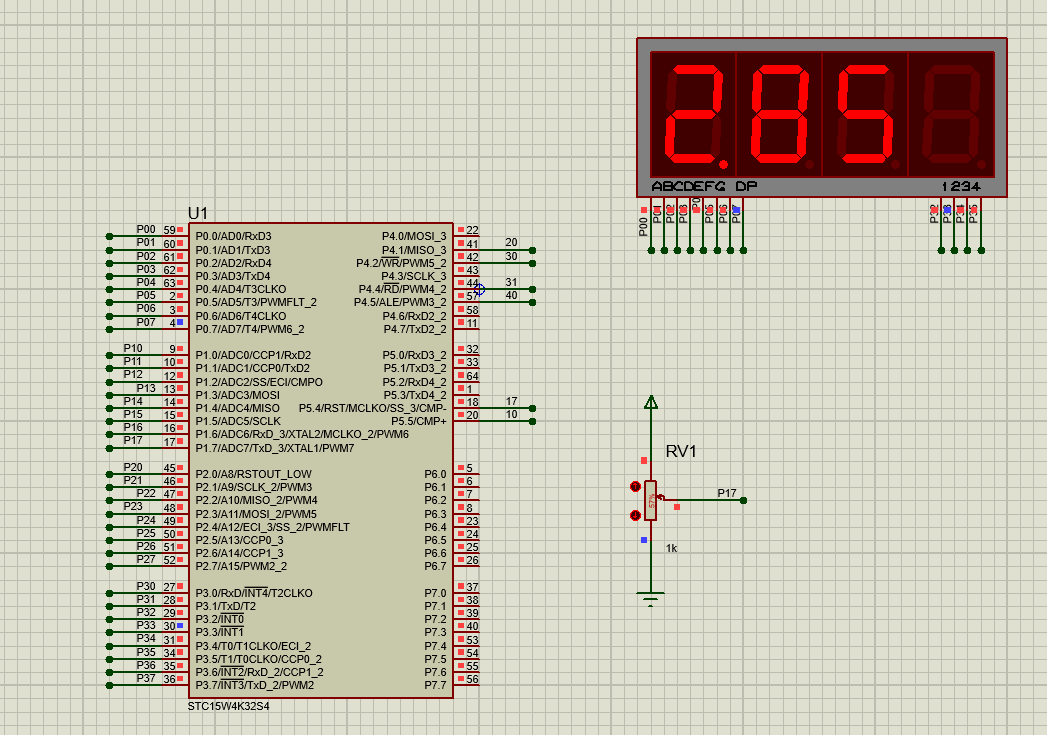 1、在PROTEUS软件仿真环境下,采用STC15系列单片机内部A/D转换器对电位器提供的模拟电压信号进行定时采样,结果送数码管模块显示;(仿真电路图如图5.1所示)