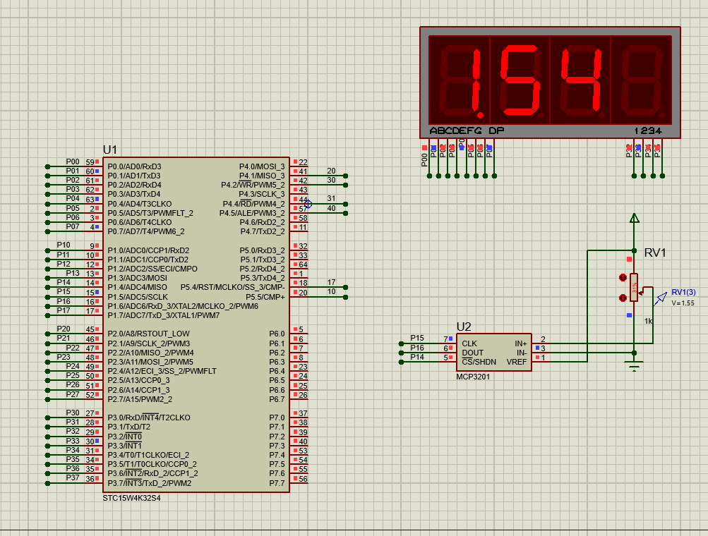3、在PROTEUS软件仿真环境下,用电位器产生0-5V电压,用MCP3201做A/D转换器读取电压,结果送数码管显示;(仿真电路图如图5.3所示)