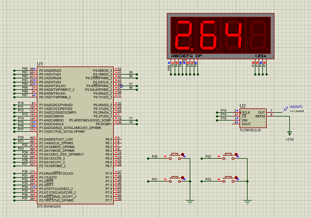 - 功能:通过按键调节数字量,驱动 TLC5615 输出 0-5V,并显示设定电压。