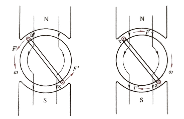 当线圈ax中通入直流电流时,线圈边a和x上均受到电磁力,根据左手定则确定力的方向。这一对电磁力形成了作用于电枢的一个电磁转矩。