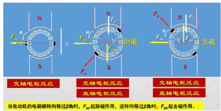 换向器配合电刷对电流的换向作用,线圈边只要处在N极下,电流总是由电刷A流入;线圈边在S极下时,电流总是从电刷B流出,使电动机能连续旋转(逆时针转矩),旋转后负载类型有变化:线圈两端感应出反电动势