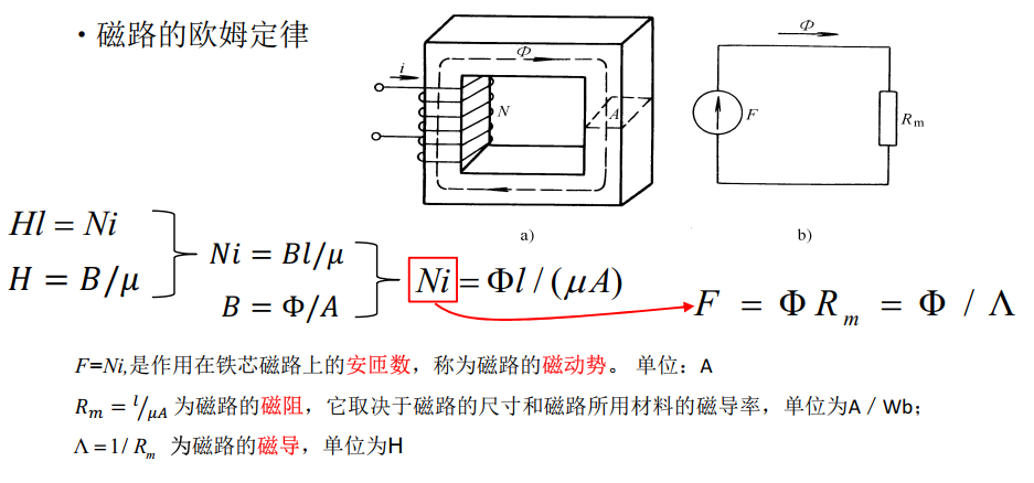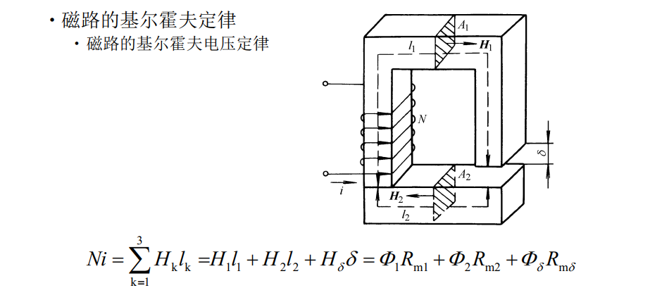 - 磁路的基尔霍夫电压定律:\(\sum F = \sum Hl = \sum \phi R_m\)