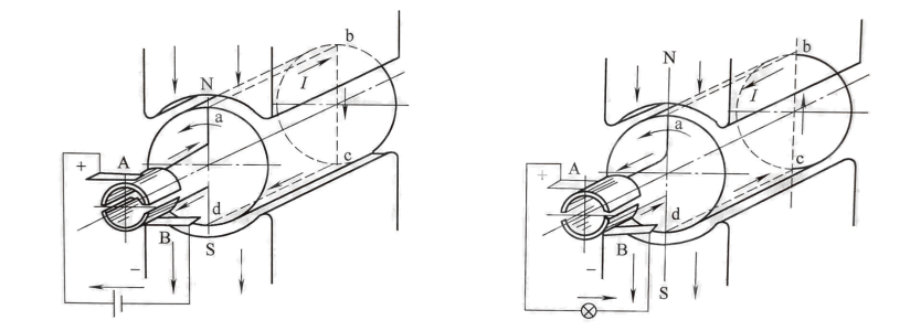 如上图所示,用原动机拖动电枢逆时针方向恒速转动,线圈边ab和cd就分别切割不同极性磁极下的磁场,线圈中产生了交变的电动势,由于换向器配合电刷对电流的换向作用,在电刷A、B端的电动势是直流电动势